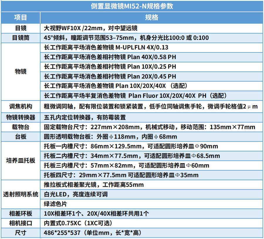 MI52-N是一款无限远光学系统的倒置显微镜,具有明场和相衬观察方式,并可升级荧光观察,可满足透明样品(如细胞、线虫等)的观测,适用于常见培养皿或切片样品观察,可用于细胞培养、组织培养、透明材料等应用。