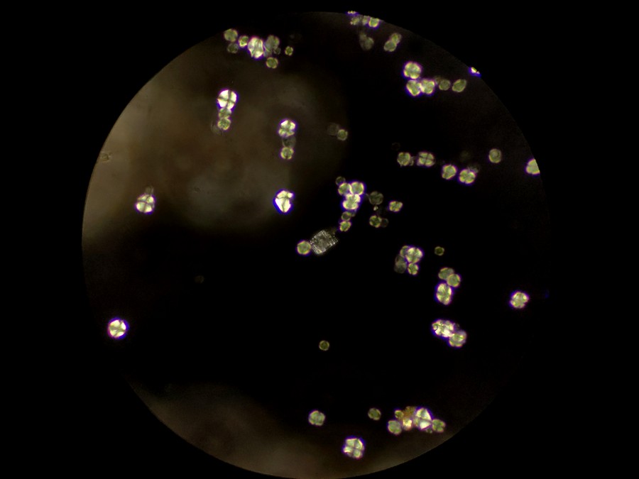 在其他视野中,我们也看到了一些其他偏光反应,可能是草酸钙簇晶之类成分,也可能是玻片或者水中的杂质。