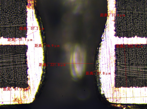 明美透反射金相显微镜MJ31用于PCB电路板的观察,其视场大、成像清晰且对比度好。兼容明场和偏光的观察方式对PCB电路板进行观察检测。搭配明美1000万像素、1/1.7英寸芯片的显微数字相机MSX1,在电脑上用明美自主研发的成像分析软件“Mshot Image Analysis System”进行测量分析,能够清晰地观察到纤维的细节及精准地测量出PCB板横截面的铜厚、孔铜厚、油墨厚、介质层厚、芯板厚度等参数。