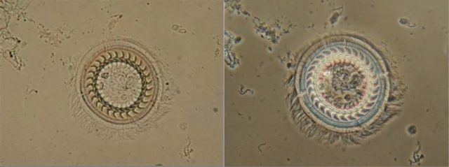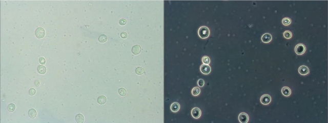 相衬观察成像特征是变暗的背景和样品边缘出现较厚的白色光环,主要用来看活细胞、水生物、薄组织切片之类透明样品,可以呈现样品细节,在厚度5-10μm时效果较好,厚样品、非透明样品看起来可能跟明场差不多。
