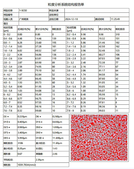 另外,可以进一步搭配明美颗粒度分析度识别软件,对乳液中颗粒进行数据化分析。明美颗粒度分析软件通过对导入的样品摄影图进行识别分析,标记出我们所需粒径大小范围的目标进行计数、统计,形成数据清晰的颗粒度分析报告: