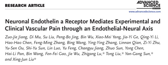 近日,南通大学药学院刘兴君教授团队联合国内多个院所在国际顶级期刊《Advanced Science》(影响因子14.3)发表重磅研究,首次揭示血管内皮细胞通过ET-1/ETAR信号通路调控血管痛的全新机制。