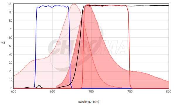 荧光信号的获取在于激发光和发射光的选择,激发滤光片需匹配光源中心波段与染料激发谱段,发射滤光片需覆盖染料发射谱段峰值。以下是cy5、cy5.5两个典型chroma公司滤光片组光谱图。