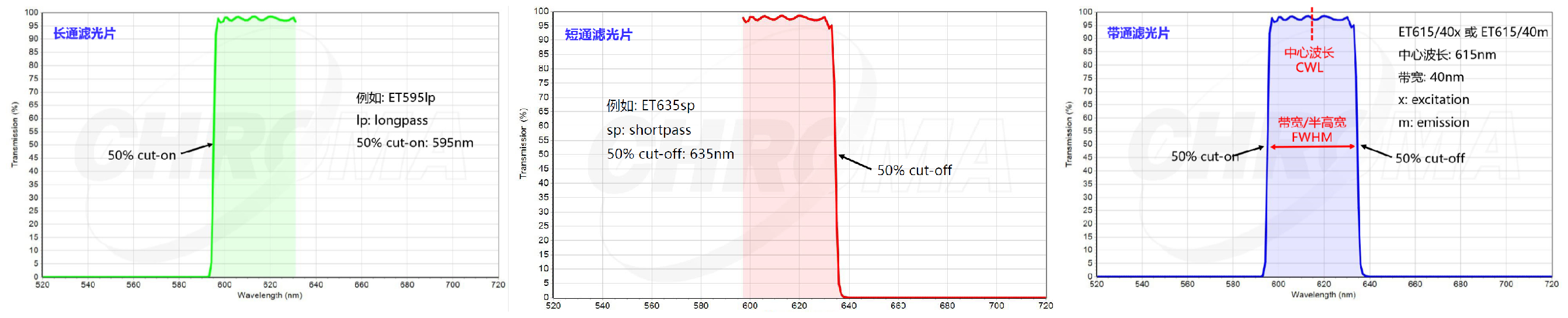 滤光片的三种类型:长通(LP)、短通(SP)、带通(BP)