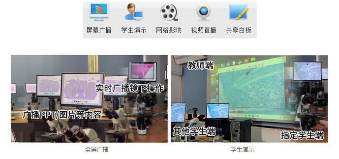明美数码显微镜互动教学系统可以通过“屏幕广播”将教师端的示教的标本或其他教学内容同步实时地广播给学生;或者可以通过“学生演示”功能将某个学生端的标本图像广播给其他学生;亦可以打开“共享白板”,让教师与学生能够在同一个白板上编辑操作,实现示教内容的高度统一,使学生能够在有限的实验时间内掌握大量的知识。