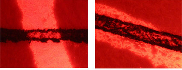 如下图;左图为明场透射光的图片,右图为荧光图,对比左右两图可以发现,在交叉部位的非孔漏处有荧光,即为先墨后朱。