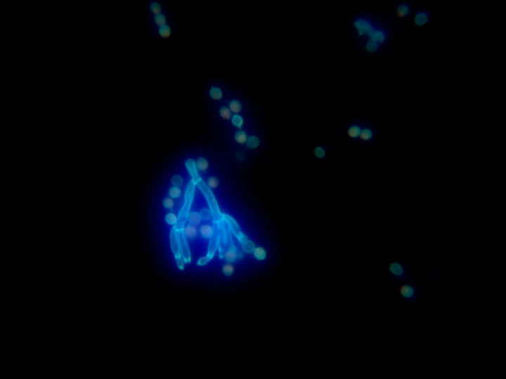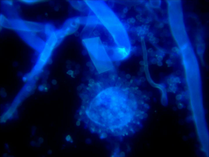 在荧光显微镜下,可见“双异型的45度分支”,菌丝较大,菌体有许多复杂的分枝菌丝构成,紫外激发下有蓝色和绿色荧光。