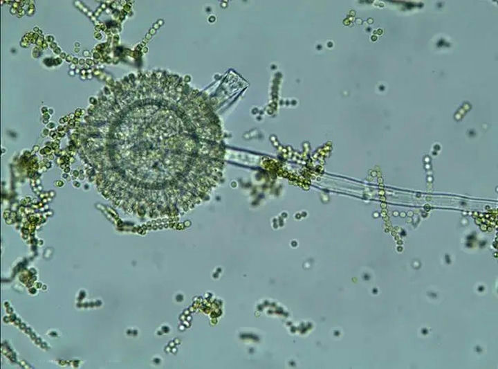 在生物显微镜下,分生孢子为球形,菌丝发达,有隔膜和多分枝,顶部形成球形顶囊