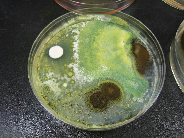 培养皿中看到,菌落生长较快,结构疏松,表面灰绿色,背面无色或略呈褐色。
