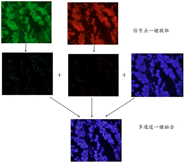荧光显微镜检做为FISH检测最后一道关键工序,在推进FISH技术的进程中扮演着不可或缺的角色。Mshot明美开发了FISH荧光镜检的整套解决方案,这其中包括Mshot明美科研级正置荧光显微镜MF43-N以及专用于FISH检测的医学影像处理软件系统Mshot V2.0,医学影像处理软件系统配套了2100万像素科研级制冷高分辨率、高灵敏度、高特异性的荧光摄像头,软件具有自动荧光信号点提取、景深扩展、多通道融合及自由报表等功能,打通FISH样片荧光检测—图像处理—出具报告这条完整产线的应用需求。其中强大的自动荧光信号点提取功,可以将提取出的信号点不丢失、亮度不减弱,快速且准确,大大提升了FISH图像处理效果以及FISH图像处理效率。以下是FISH荧光信号点一键提取功能的效果演示。