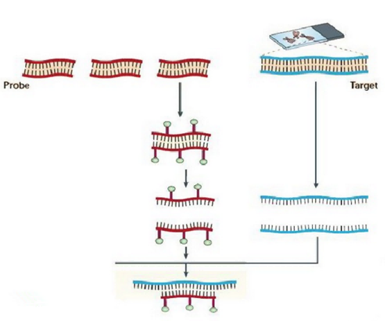 利用DNA碱基对的互补性,将直接标记了荧光的单链DNA(探针)和与其互补的目标样本的DNA(玻片上的标本)杂交,通过观察荧光信号在染色体上的位置反映相应染色体的情况。