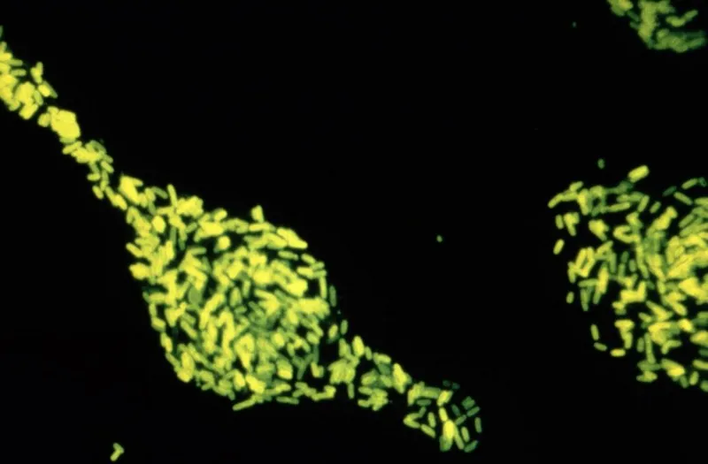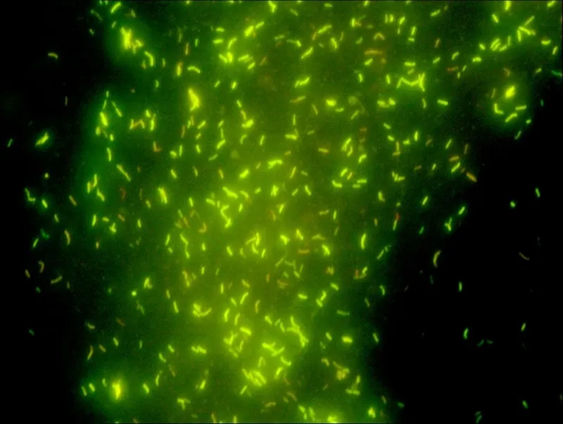 荧光观察下的念珠菌。念珠菌感染是一种常见且具有潜在危害的疾病,为了预防,建议保持良好的个人卫生习惯,增强身体抵抗力。