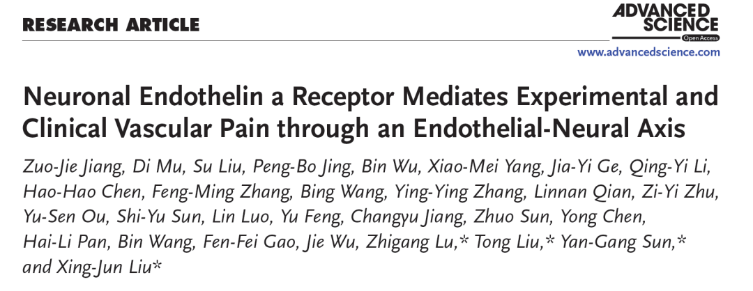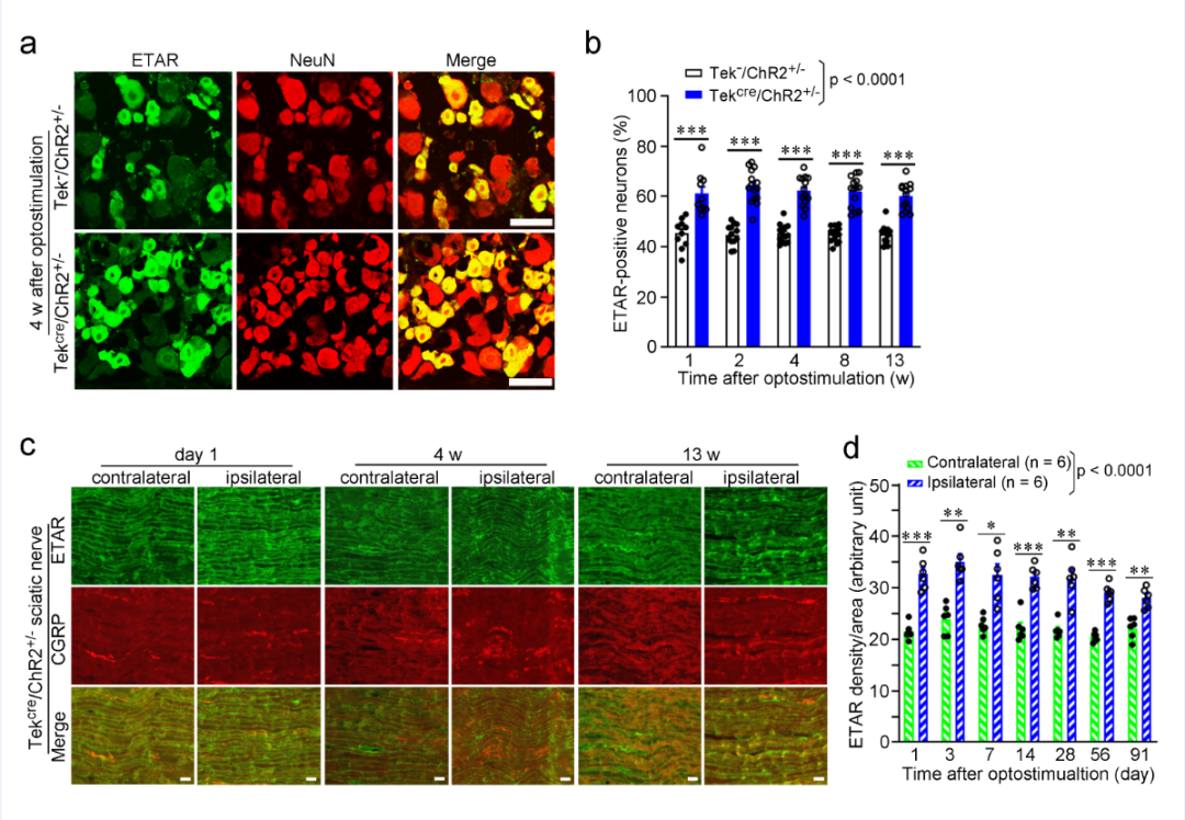 通过光遗传学、化学遗传学及转基因技术,团队发现血管内皮细胞来源的ET-1(内皮素-1)通过激活伤害性感觉神经元上的ETAR受体,形成“内皮-神经-脊髓”调控环路,驱动血管痛发生。这一发现为临床治疗提供了新靶点。