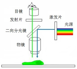 荧光显微镜的主要原理是:光源的光经过激发片的过滤,得到激发光;激发光照射到样品上,样品受激发而发射出荧光;二向分光镜可以同时反射激发光,和透射荧光。