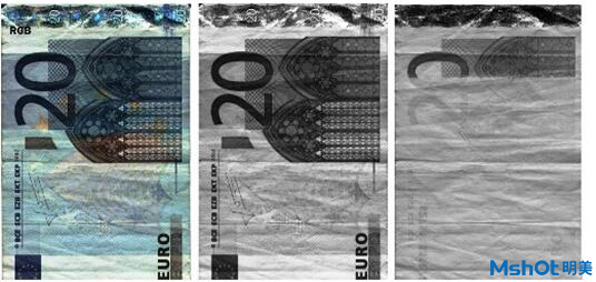 在近红外光源照射下:20欧元纸币在可见光和单色光下图像无差异,而近红外近红外相机拍摄下纸币部分消失,防伪功能突出。