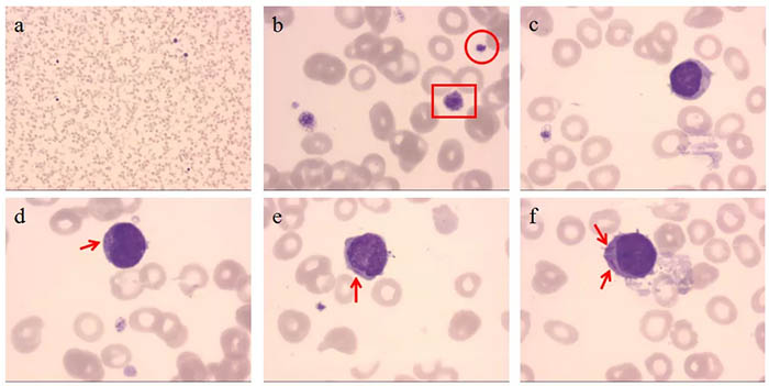 注:图2a白细胞数量减少;图2b大小不一的血小板,方框处为大血小板,圆圈处为正常大小的血小板;图2c-2f早幼粒细胞,箭头所指处为Auer小体(图2a:×100;图2b-2f:×1000)。