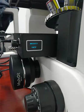 本次搭配明美新推出倒置数显荧光附件,为三色四通道结构设计,波段切换稳定顺畅。用户可根据需求,自由选择荧光波段、数量。采用LED冷光源,基于外形精简、操作简便的设计理念,将驱动电源、LED激发光源及荧光滤光组一体化。
