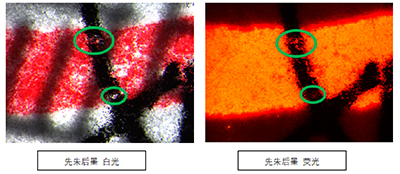 如果印泥(油)是与漏孔型激光打印机、复印机等碳粉类字迹笔画形成的朱墨时序,先拍摄一张透光照片,并标记出碳粉笔画中分布的一些小漏孔,纸张的荧光会通过这些小漏孔透射出来形成荧光点假象。我们要在朱墨交叉处非漏孔位置发现是否有荧光,来确定朱墨时序;