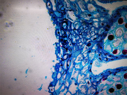 挑好一根粗细、湿度合适的树枝,用专门的工具对其进行切片。切片一定要非常薄,太厚会阻碍光透过切片,在显微镜下成像不清晰,影响观感。