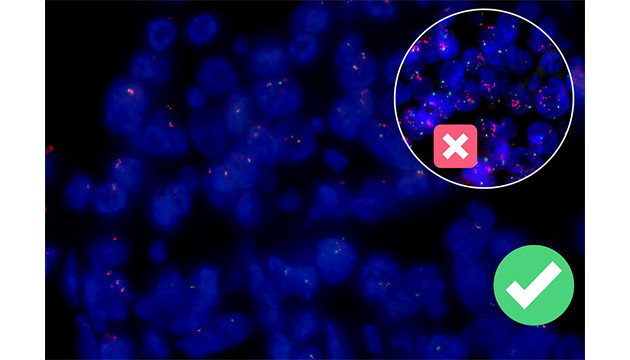 荧光原位杂交(Fluorescence In Situ Hybridization,FISH)是临床病理检测中广泛运用的一种分子细胞遗传学诊断技术,其原理是用荧光染料直接或间接标记的DNA核酸探针与待测样本中的DNA核酸序列按照碱基互补配对的原则进行杂交,然后通过荧光显微镜观察荧光信号位置、数量等来判断待测序列的缺失、扩增及易位等情况。其高分辨率、直接反映异常细胞比例、快速简便的特点,使其成为临床检测、预后评估及用药指导的重要工具。