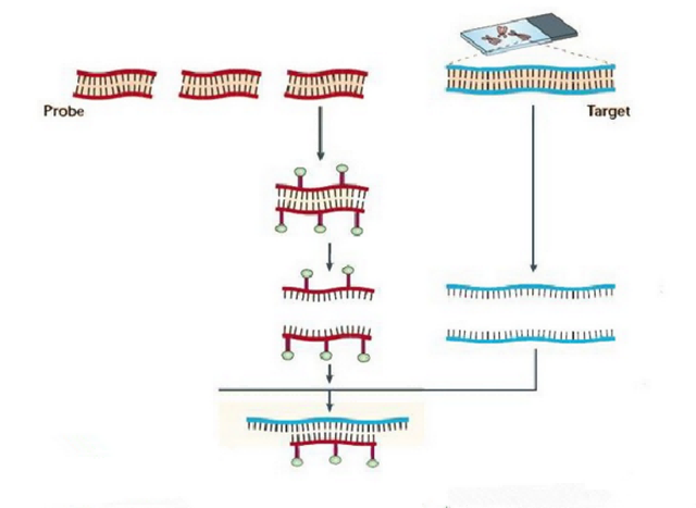 要想使用好这个工具,就不得不说说它的生物学原理。高中生物让我们学到了生命重要的遗传物质--DNA(脱氧核糖核酸),它是由特定的碱基序列配对形成的双螺旋结构,也就是A(腺嘌呤)—T(胸腺嘧啶)配对,G(鸟嘌呤)—C(胞嘧啶)配对。FISH荧光原位杂交技术的核心在于使用荧光标记的DNA探针与待检测样品中的目标DNA序列发生特异性的互补配对,在进行FISH荧光原位杂交之前,DNA双螺旋结构经过处理分解为单链的目标DNA,而探针DNA通过人工合成或PCR扩增并在其一端标记上荧光染料,在特定的温度和盐浓度下形成探针—目标DNA配对这样的双链结构,然后对样品进行洗脱,洗去未结合的探针染料(减少背景杂光干扰),而结合上的荧光染料标记的探针会发出特定颜色的荧光信号