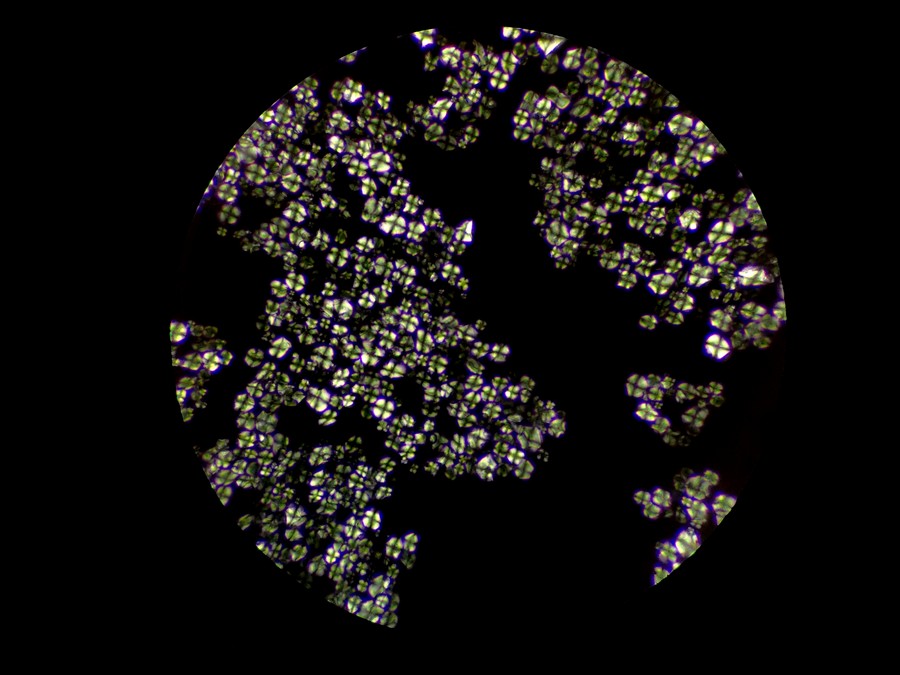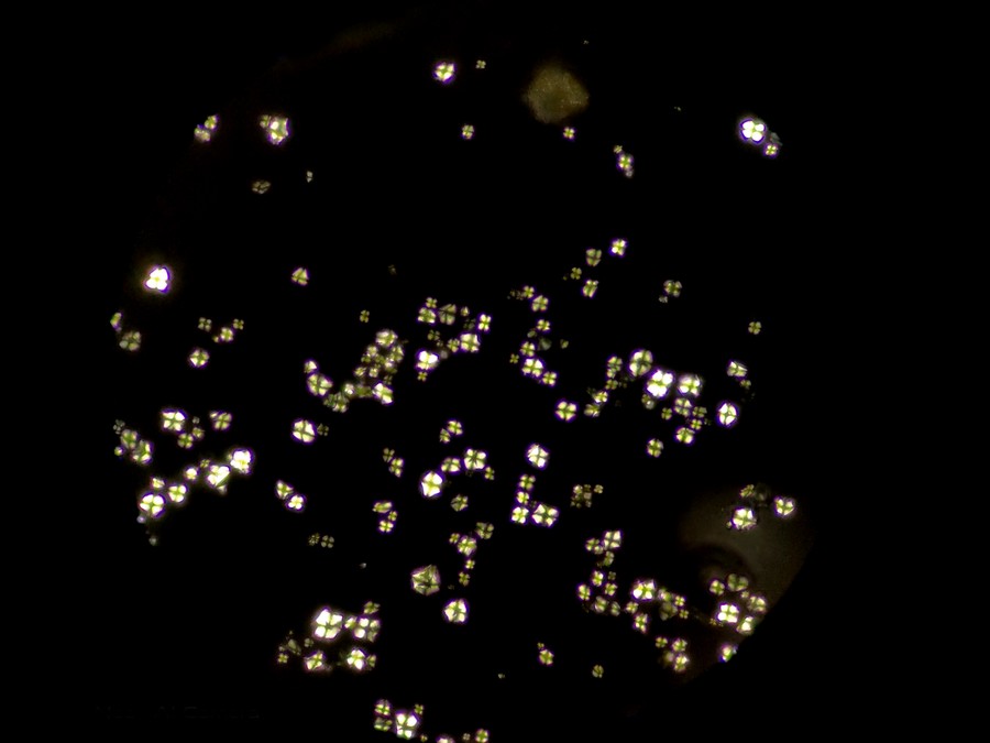 在其他视野中,我们也看到了一些其他偏光反应,可能是草酸钙簇晶之类成分,也可能是玻片或者水中的杂质。