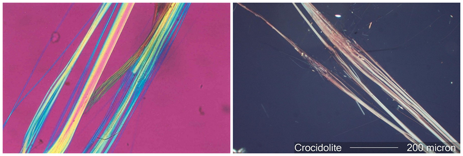 角闪石类矿物石棉(左铁石棉Amosite,右青石棉Crocidolite)