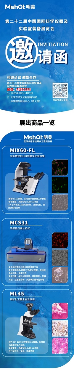 届时,明美光电将展示活细胞扫描分析仪 MCS31、倒置荧光显微镜 MIX60 - FL、研究级生物显微镜 ML45等多款行业领先产品。诚邀您莅临我们的展位:A区E2291,共同探讨行业发展趋势!