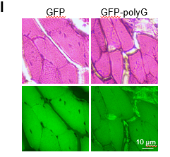 过表达poly-G蛋白导致小鼠肌肉出现边缘液泡。对P1小鼠的肌肉注射AAV-GFP与AAV-GFP-poly-G病毒,