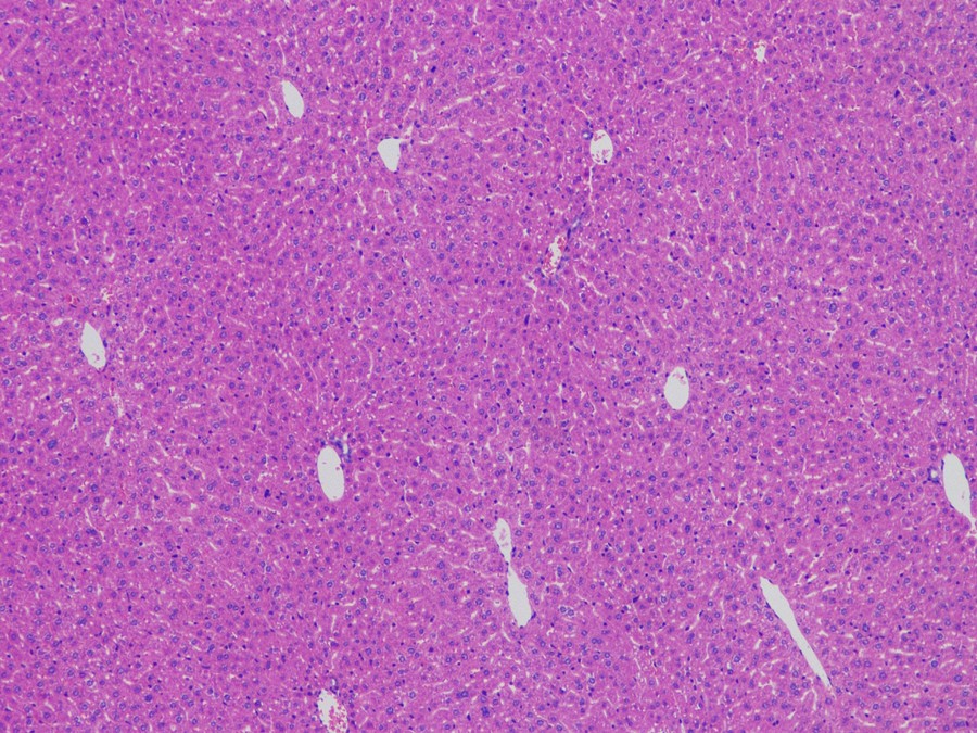 肝脏主要由肝细胞组成,正常的肝脏HE染色切片在镜下呈现为绵密的肝细胞,细胞核清晰可见且形状比较规则,细胞间有少量不规则的空洞区域。