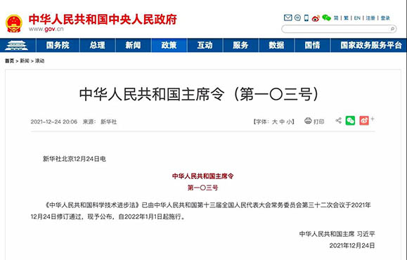2021年12月24日,中华人民共和国第十三届全国人民代表大会常务委员会第三十二次会议修订通过了《中华人民共和国科学技术进步法》(后称《科学技术进步法》)。