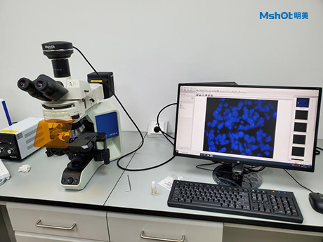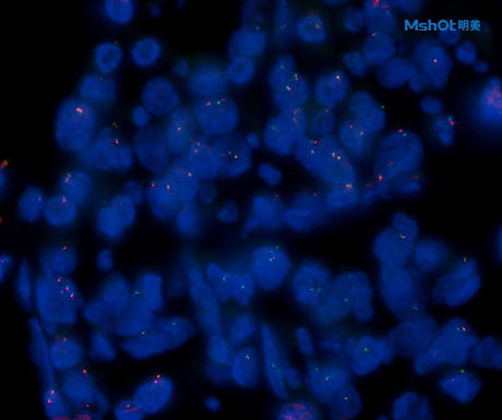 明美荧光显微镜MF43-N,加上高灵敏度显微镜相机MC50-S,是应用于FISH观察及研究的整套显微成像系统。MF43-N,作为明美研究级别的正置荧光显微镜,常用于FISH、FRET或CTC检测领域的研究,配备的大功率宽光谱LED光源,是具有发热少、光源寿命长、维护成本低等优点的荧光光源;另外,6孔转盘式荧光模块的设计,可使得操作者灵活转换荧光激发块,方便研究应用。明美显微镜相机MC50-S,是具有500万像素的高灵敏度相机,适合弱光环境下成像,效果显著。目前该套显微成像系统,正式进入深圳市禾正医院病理科,进行荧光原位杂交的研究,客户表示很满意。