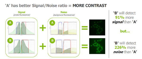 使用带通滤光片可以获得相对更高信噪比的荧光成像,而不同参数的带通滤光片,会对成像效果有重大影响,比如下图A和B两组带通滤光片,A组滤光片是窄带,搭配比B组能多检测出90%的有用信号,减少200%的背景干扰信号,在图像上表现为A组信号更清晰透亮。此外,由于技术水平问题,国内窄带滤光片的截止深度(OD)要比进口差,光谱表现为光通效率到边缘“缓坡下降”而不是“断崖下降”,最终成像效果不如进口窄带,单要稍优于普通带通。
