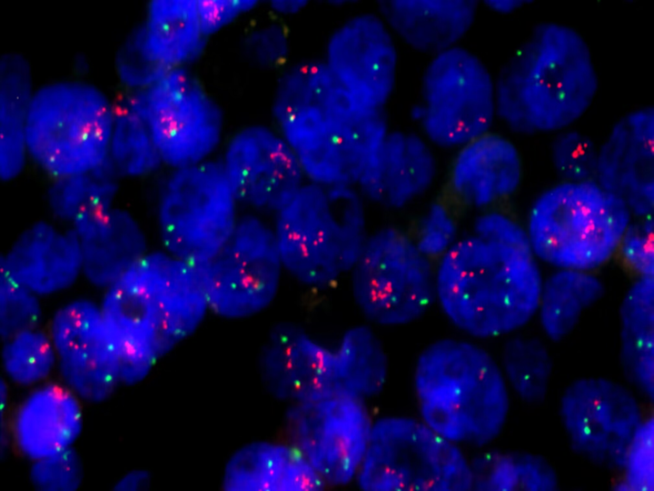 HER是一类与细胞增殖息息相关的蛋白质,全称是human epidermal growth factor receptor,中文叫作人表皮生长因子受体。HER蛋白质家族共有四兄弟,其中HER2负责将细胞膜外的生命信息传导至细胞内,是乳腺癌诊断指标之一,检测HER2一般用正置荧光显微镜,使用免疫组化或荧光原位杂交FISH技术。