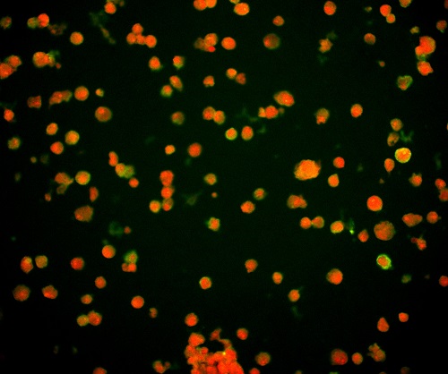FISH做的病毒检测,红色为病毒外壳蛋白