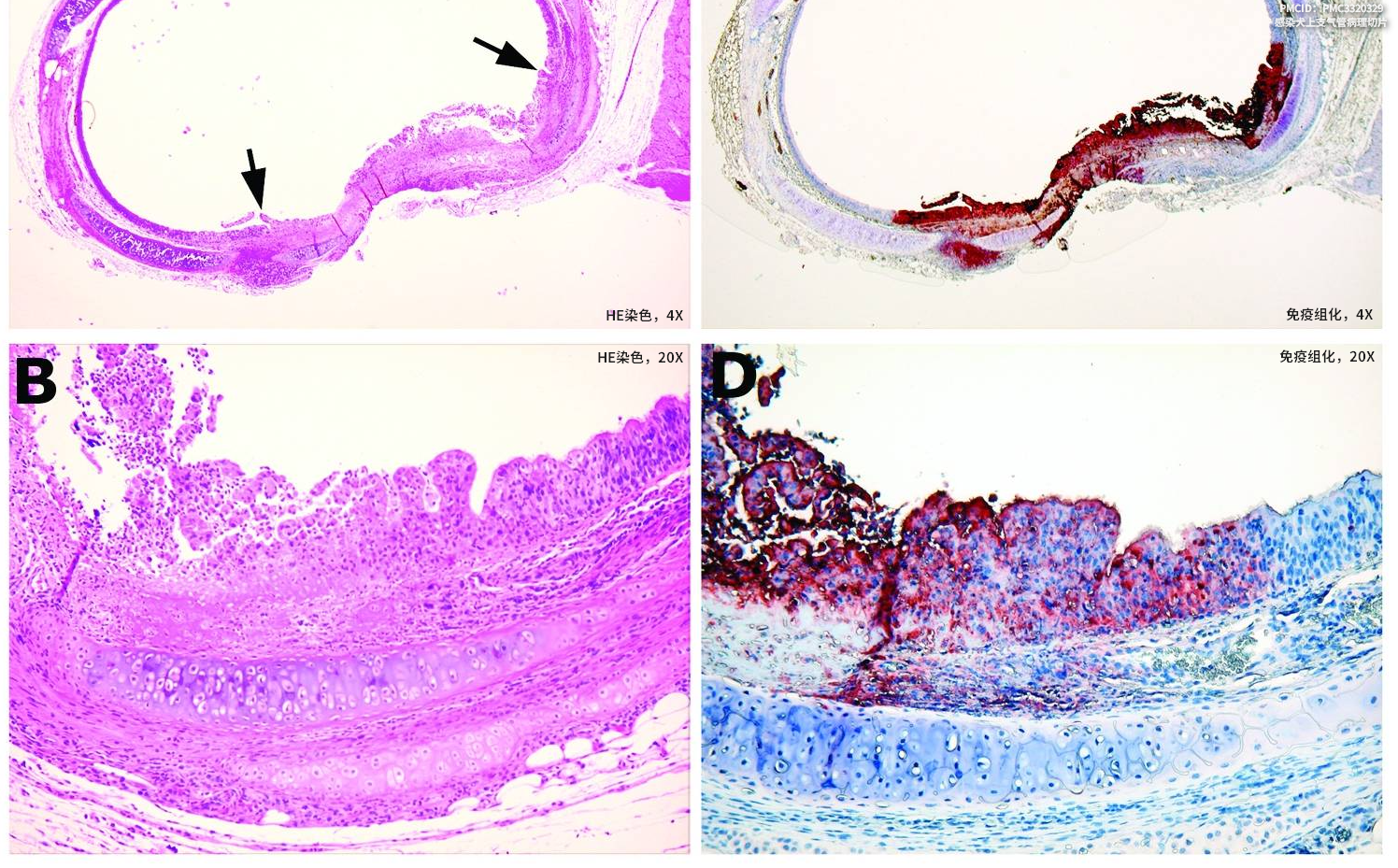 IHC免疫组化染色,猴痘病毒感染犬的支气管(红色为病毒反应)