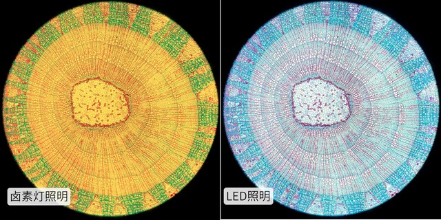 目前专业LED光源已逐步成为主流,其色温恒定在5000K左右,接近日光的平均色温,显色性较好,人眼观察和数字相机成像都有较好效果。此外LED光源功耗低亮度高,一般3W LED可以达到30W卤素灯光强,方便即开即用,寿命长,免维护,因此明美大部分显微镜均默认采用LED作为明场光源,卤素灯则作为可选。