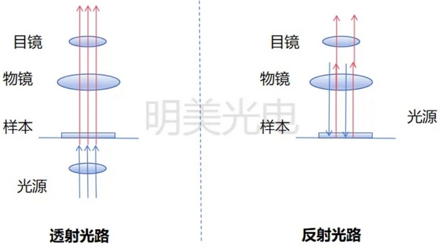 明场观察有透射照明和反射照明两种照明方式,前者是照明光线透过样品后进入物镜,主要适合有透明度的薄样品;后者是照明光线照射到样品后反射进入物镜,主要适合不透明的厚样品。