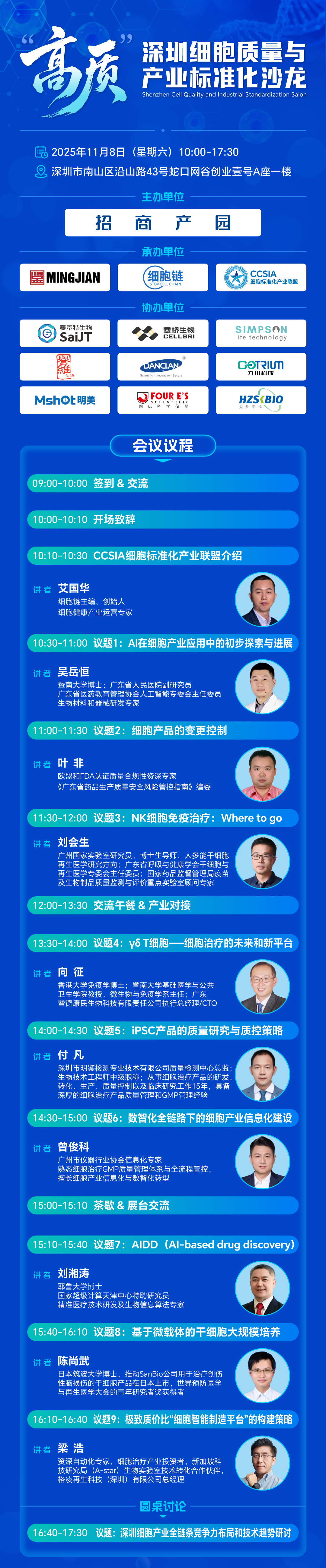 围绕细胞全产业链质量和标准化,2025年11月8日,深圳细胞质量与产业标准化沙龙将在深圳市招商蛇口网谷举行。本次活动以“高质”为主题,探讨高质量的细胞产品全链条质控,以及细胞产业高质量发展相关话题。欢迎提前报名!
