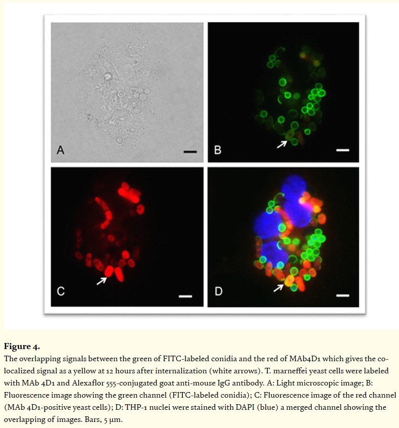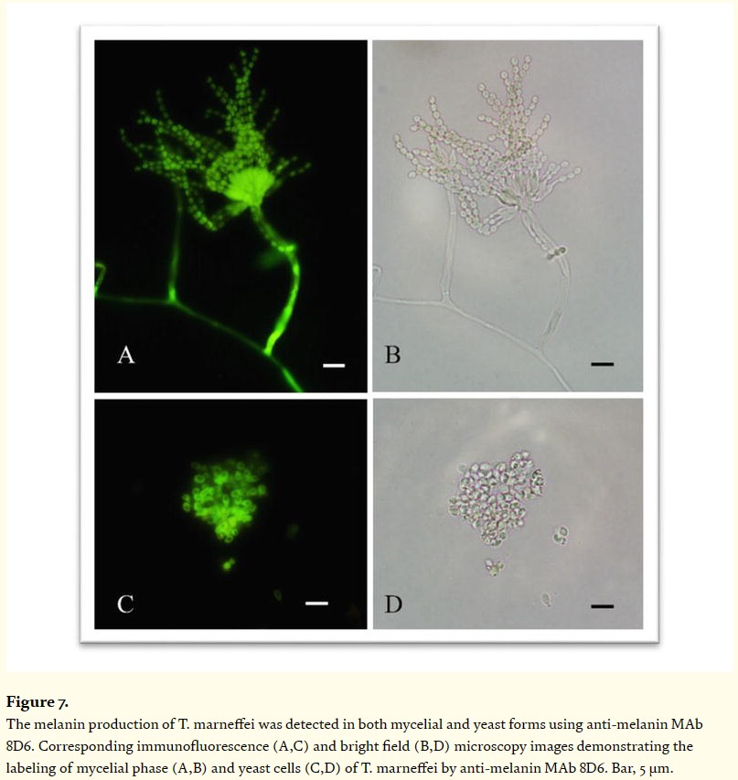 进一步研究马尔尼菲篮状菌的致病性,用FITC标记真菌黑色素,证明无论是菌丝态还是酵母态,都出现明显的荧光反应,显示马尔尼菲篮状菌双态下都有真菌黑色素作为毒力因子,干扰宿主免疫系统正常响应,这可能是其能在体内深层引起多器官感染的其中一个原因。
