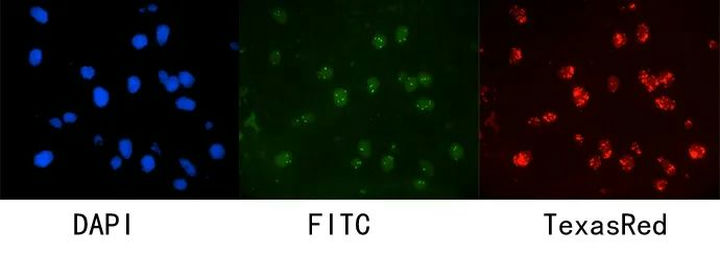 (4)荧光成像要求相机灵敏度高。FISH探针信号往往都是点状或成簇分布,要求显微成像相机有较高的灵敏度,同时具有良好的噪声控制,这样才能在背景荧光中获得所需的点状/簇状探针信号。明美MC50-S等荧光显微相机,像元尺寸超过3μm*3μm,具有优良的弱荧光捕获能力,同时具有超低的读取噪声,可保证FISH检测中获得良好的荧光成像。