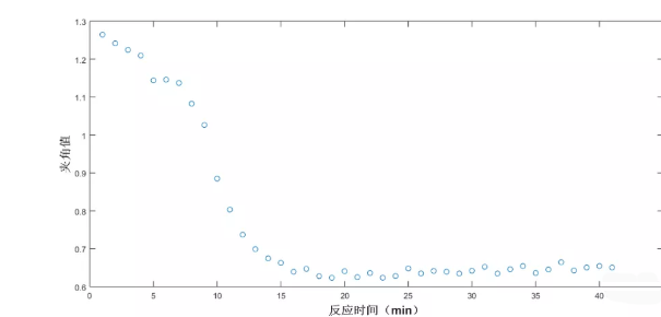 3)绘制夹角值和时间的关系图,得到合成过程生成物乙酰水杨酸(阿司匹林)的反应趋势,判断反应终点。图2为不同反应时间下样本中对应阿司匹林夹角值的变化趋势图。
