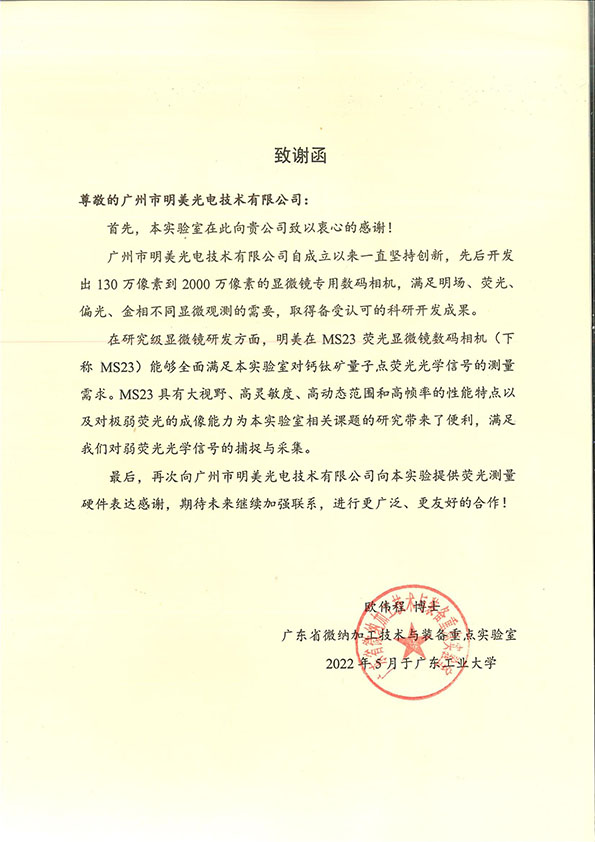 广东工业大学实验室急需一套显微镜相机能满足对钙钛矿量子点荧光光学信号的测量需求。明美工程师站在用户的实际需求推荐明美显微镜相机MS23,该显微镜相机具有大视野、高灵敏度、高动态范围和高帧率的性能特点以及对极弱荧光的成像能力为实验室相关课题的研究带来了便利,满足了老师对弱荧光光学信号的捕捉与采集。