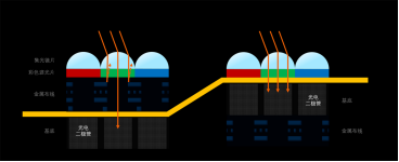 在传统的前照式CMOS传感器中,光敏元件(像素)位于电路元件的后面,这意味着光线必须穿过电路层才能到达光敏元件,这限制了光的接收效率。而背照式CMOS传感器的光敏元件位于电路的前面,这样光线可以直接照射到光敏元件上,从而显著提高了光的接收量和传感器的量子效率。