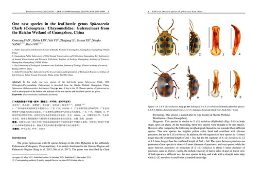 据广东省科学院信息,该院动物研究所杨星科研究员团队近日在广州海珠国家湿地公园发现一个稀有昆虫新物种,其隶属于昆虫纲鞘翅目叶甲科萤叶甲亚科斯萤叶甲属。科研团队将其命名为“海珠斯萤叶甲”。该成果已发表于学术期刊《昆虫分类学报》上。据广东省科学院动物研究所学术所长杨星科介绍,以往发现新物种一般是在野外的自然环境下。此次在城市湿地环境中发现新物种比较罕见,也是广州城市生态环境恢复的一个重要指征。