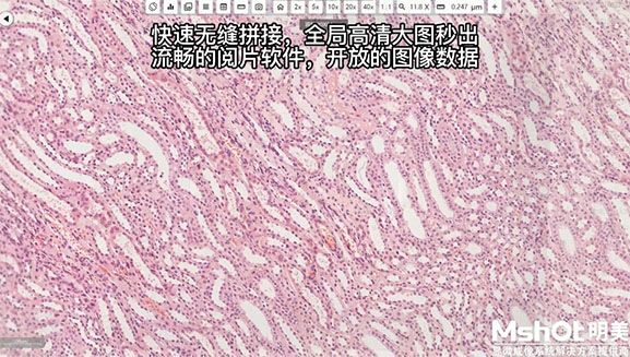 扫描完毕后,数字切片扫描系统整合的高性能电脑能快速无缝拼接输出全局高清大图,阅片软件运行稳定流畅,并且由于图像数据采用了开放的格式,用户后期可以很方便地进行各种科学研究和计算。