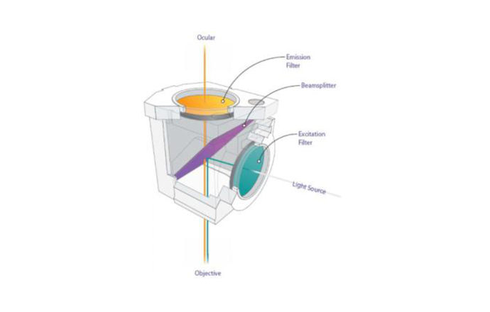 激发块(cube)里面包含激发滤光片(EX)、二向分光镜(DM)和发射滤光片(EM)。激发滤光片用于把光谱光源收窄成激发光波段,避免其他波段的光线进入激发块形成干扰;二向分光镜既能反射激发光到样品上,又能让样品发射光通过,到达发射滤光片;发射滤光片会把发射光以外的激发光、杂散光都过滤掉,从而让用户更清晰地观察目标荧光标记。