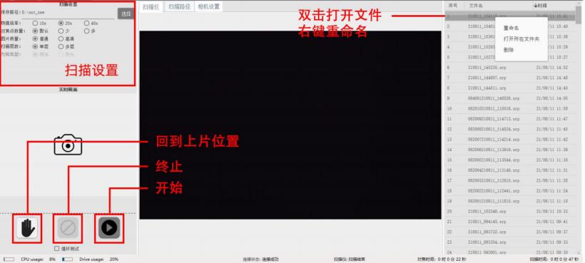 高帧率扫描相机,扫描帧率>120fps,分辨率1920*1200,曝光时间<7μs,由于标配的是双光路C接口,还预留一个接口可以用于安装大靶面显微相机,保留原显微镜单视野高分辨率拍照功能。