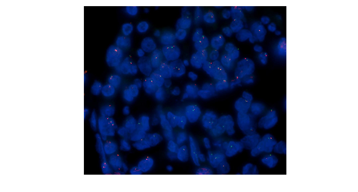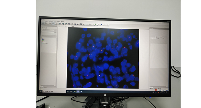深圳禾正医院的老师采用了明美的MFISH荧光原位杂交分析系统,检测中用her2/cep17的比值来测定是否有此原癌基因扩增,当HER2/CEP17比值≥2.0时,为HER2阳性;此外老师还定制了双通道荧光模块,可以同时在目镜下观察到红绿两种颜色的信号点,大大提高科室的工作效率。
