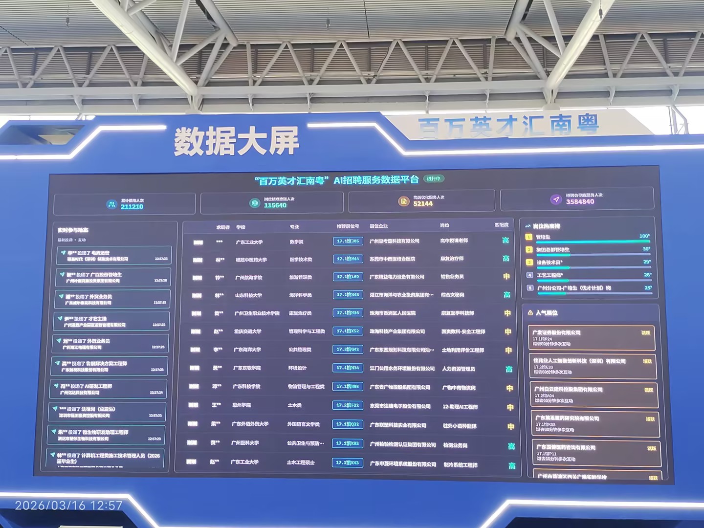 3月15日至16日,由广东省精心打造的“百万英才汇南粤”2026年春季大型综合招聘会在广州广交会展馆D区盛大举行。作为近年来省内规格最高、规模最大、要素最全的引才盛会,本次招聘会汇聚近2000家头部单位,释放超8.5万个优质岗位,吸引超17万人次求职者入场,盛况空前。